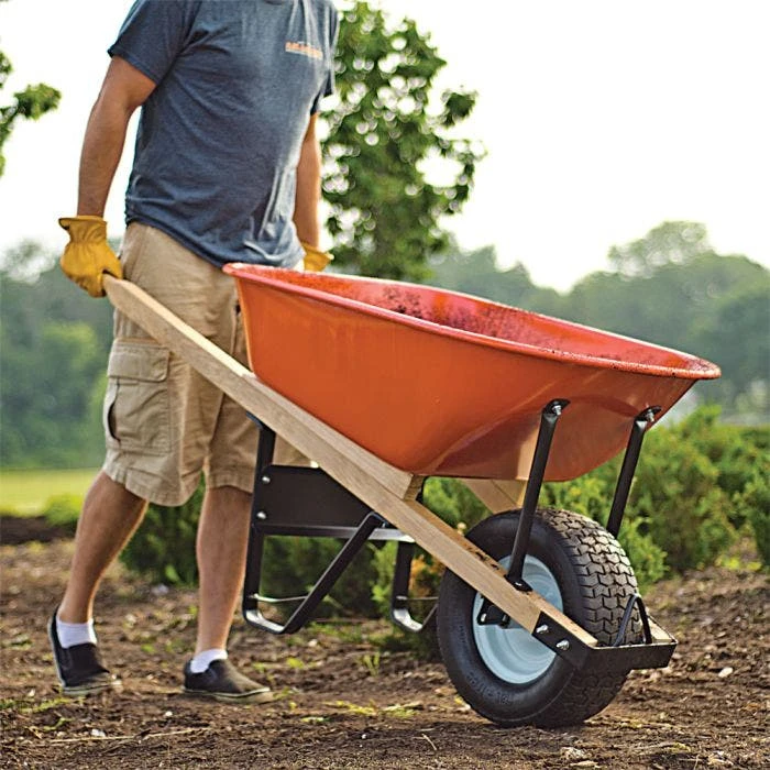 These 6-cubic-foot wheelbarrows support up to 500 pounds. Their welded tray support improves both durability and performance; however, you can choose to omit the brace for a lighter wheelbarrow. The combination of features and low-profile design increases stability. This increased stability allows you to transport even the most substantial loads over uneven surfaces with ease. A narrow profile allows the wheelbarrow to fit through most common doorways and gates with ease.