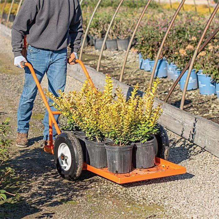 The Leonard Flatbed 2 Wheel Nursery Cart has a premium powder coat, durable, and distinctive orange finish, making it weather-resistant and sharp-looking.