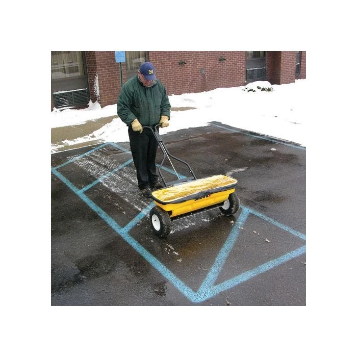 Control rock salt and deicer applications with SnowEx’s Professional Drop Spreader. Applies with a spreading width of 28 inches from the durable LLDPE safety yellow 160 lb capacity poly hopper. 10-gauge wire grid helps break up and filter any clumps keeping the applications consistent. 13-inch pneumatic tires operate the independent agitator bars. Includes clear hopper cover. Choose from powder coated or stainless steel frame. These products must ship via motor freight.